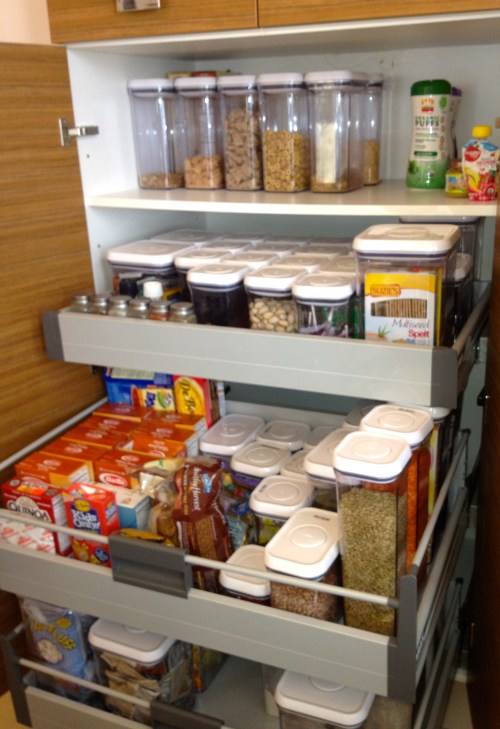 2. The 2 small boxes in front are OXO pop-up containers. They came free with the 10- piece- set, and are usually too small to store food items so I shifted them to here. (FIND A USE FOR EVERYTHING!- or scrap it!)