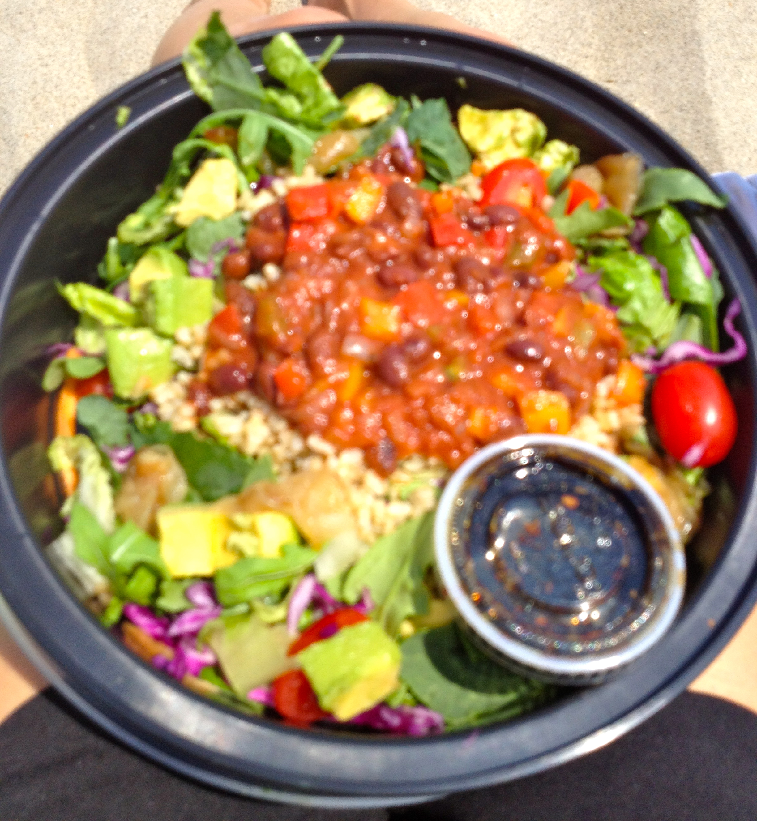 Salad no. 1: Tons of different greens (think -varied greens, varied health benefits…) that have already been chopped for the week, prepped and ready to go (check out my Tips & Tricks and Minimalist Kitchen categories to get a few more prep hints). There is romaine lettuce, baby arugula, cabbage, grape tomatoes, and a healthy dose of omega-3’s in that gorgeous avocado. I also stole some onions from the squash to add some zing. The dressing is a simple clean balsamic/EVOO, with some lemon and spices…) And of course, in the middle some LEFTOVER Brown Rice and Beans…